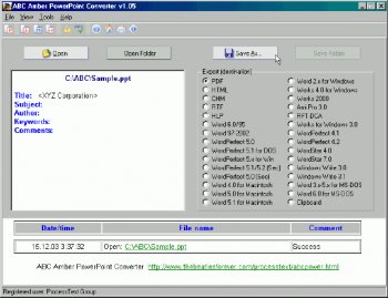 ABC Amber PowerPoint Converter is an advanced tool which converts your PowerPoint presentations to any document format (PDF, CHM, HTML, RTF, HLP, DOC, MCW, WPS, SAM, RFT, WS4, WS7, WRI, etc.) easily and quickly. It supports a batch conversion, a command line and more than 50 languages.