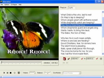 Adoration allows you to use full motion video as a background to song lyric text, and import music from CD disc, such as Integrity Music split-tracks, then play and control the playback from within the program. Multimedia presentation software for truly easy worship projection. You choose the song lyrics, music, and worship video independently, then play them jointly. |