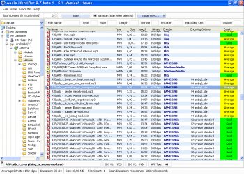 Audio Identifier is an audio inspector. You can browse through your audio collection with it and it will show you useful information like average bitrate, used encoder and settings, guessed quality, etc. It has Unicode support, the capability of exporting data as HTML and much, much more. It supports many audio formats: MPEG Audio (mp3), MPEGplus (mpc), WAV (wav), TwinVQ (vqf), Ogg Vorbis (ogg), Windows Media Audio (wma), AAC (aac), Speex (spx), Monkey`s Audio (ape), WavPack (wv), FLAC (flac),