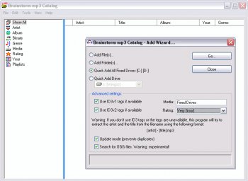 Brainstorm mp3 Catalog is dedicated to people which have a large collection of mp3 files. It is a catalog which stores information about the mp3`s like artist, title, album, year and many more (usually found in the ID3 tags). It has another option named Media which helps you find if the mp3 is on the harddisk or a removable media (and what label the removable media has). Fast recursive search or add single files - you name it and this program does it. You can rate your mp3`s and can select the rating you want from the category tree.